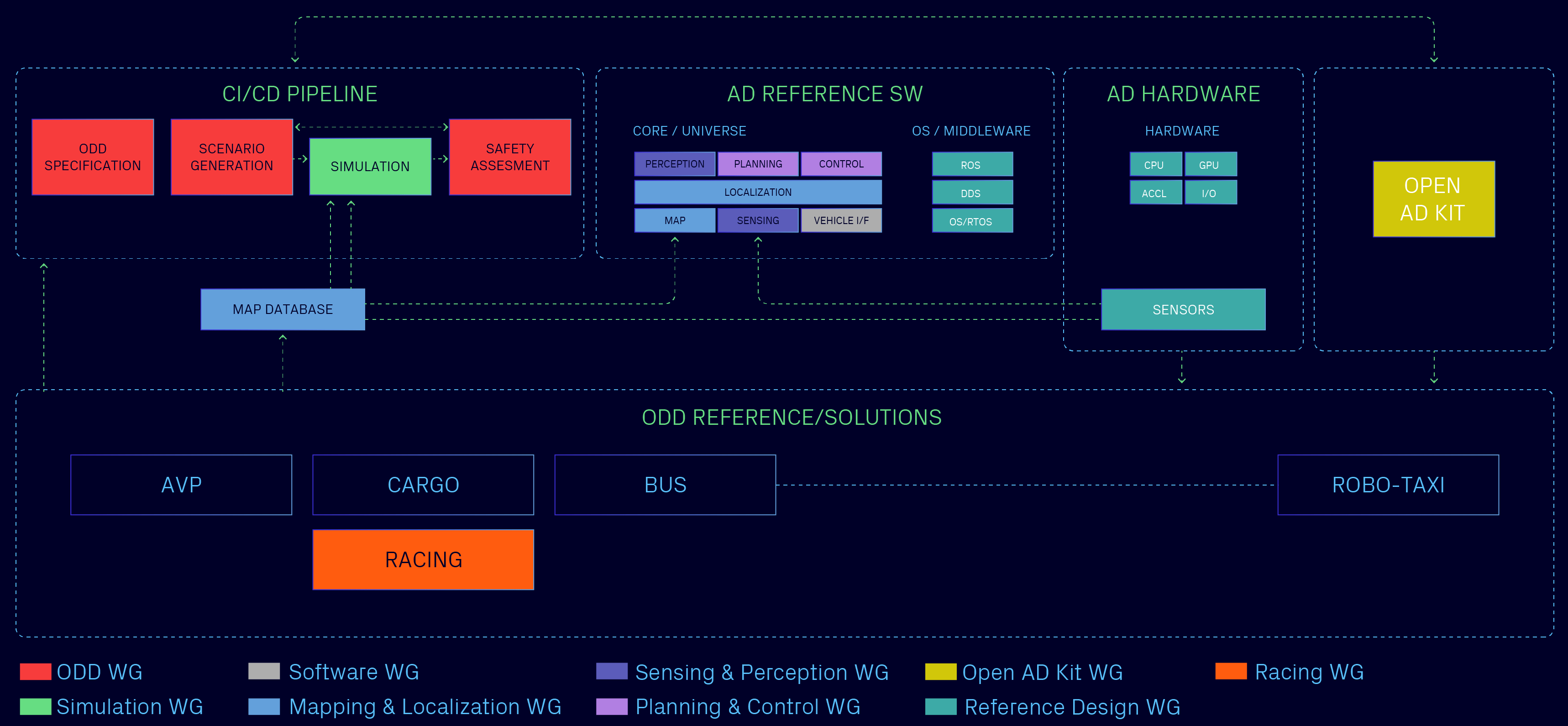 The diagram below summarizes the purpose and interactions of the different working groups within the Autoware Foundation:
