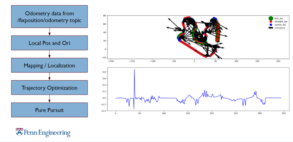 The team further optimized their setup by utilizing Point One Navigation’s Polaris RTK subscription for Network Transport of RTCM via Internet Protocol (NTRIP), which enhanced the accuracy of the real-time positioning data. The odometry data from the Vision-RTK2 was used to derive the vehicle’s local position and orientation. This information was critical for the mapping and localization stack, and after applying trajectory optimization, the kart was controlled via a pure pursuit control algorithm.