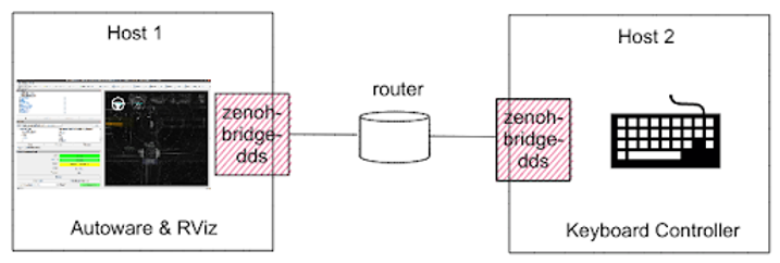 Now let’s control the vehicles remotely with the help of zenoh-bridge-dds. Our scenario is shown in the following figure: Run Autoware in Host 1 and then control it from Host 2 with a remote keyboard controller. A router is set up between the hosts to emulate the environment crossing the networks or the Internet. Since DDS cannot get across routers without vendor-dependent settings, we’ll use zenoh-bridge-dds to connect hosts separated by the router.
