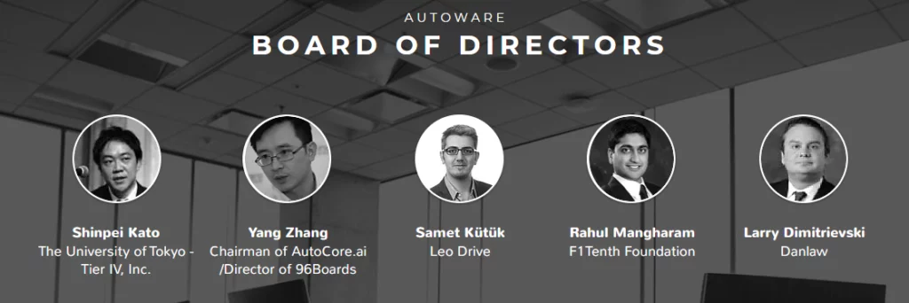 The co-founders of Autoware, Shinpei Kato (TIER IV) and Yang Zhang (AutoCore.ai), remain on the board of the Autoware Foundation. They have been joined by Samet Kütük from Leo Drive (who also leads the Marketing/Go-To-Market workgroup), Rahul Mangharam from the University of Pennsylvania (who heads the Centers of Excellence initiative), and Larry Dimitrievski from Danlaw, all of whom have joined the Autoware Board of Directors to help bring the project to new levels of success.
