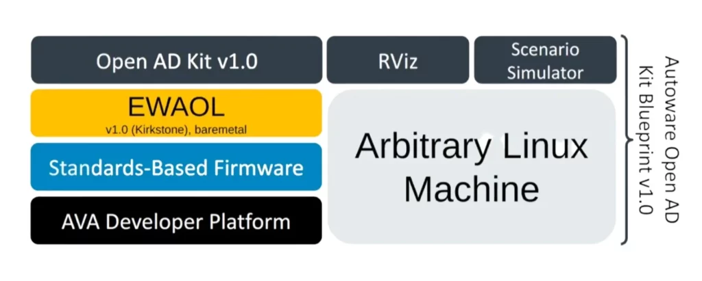 Open AD Kit Version 1.0 is built using four modules from the Autoware project: Perception, localization, planning and the vehicle interface. Open AD Kit 1.0 runs on EWAOL on an AVA Developer Platform. And the AVA Developer Platform is connected to an arbitrary Linux machine over the ethernet to visualize running Autoware nodes on the RViz tool and perform scenario simulations.
