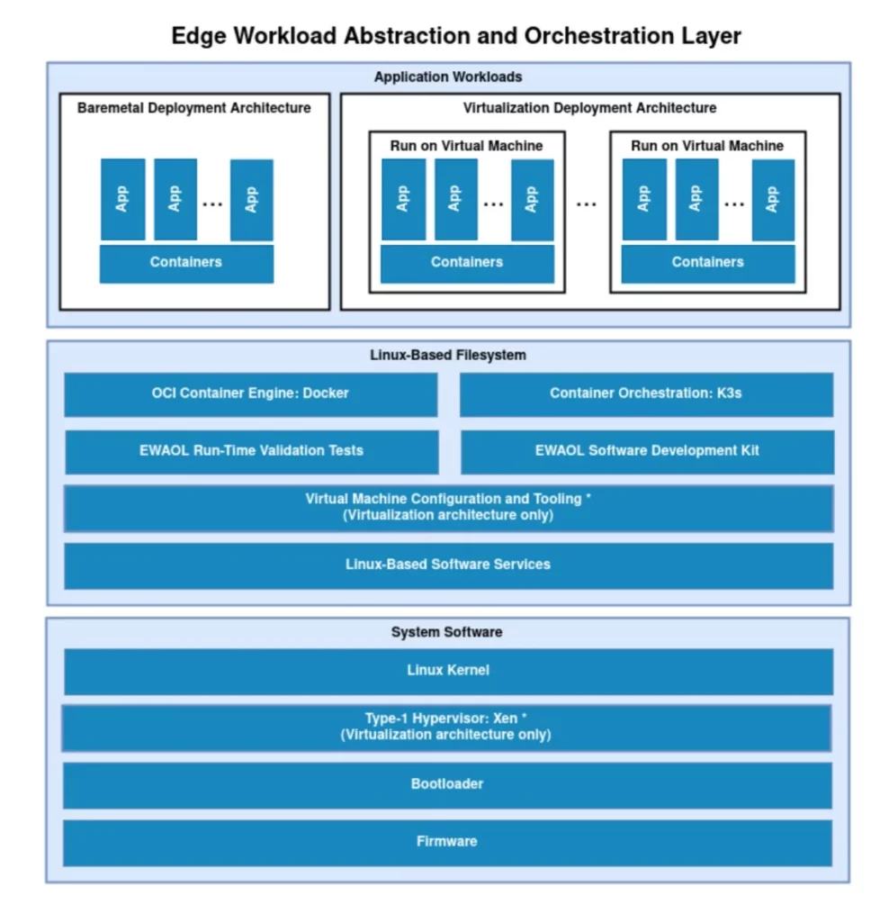 EWAOL (Edge Workload Abstraction and Orchestration Layer) is SOAFEE’s Linux reference implementation. Its primary purpose is to enable containerized and virtualized software deployment, as outlined in SOAFEE’s vision.