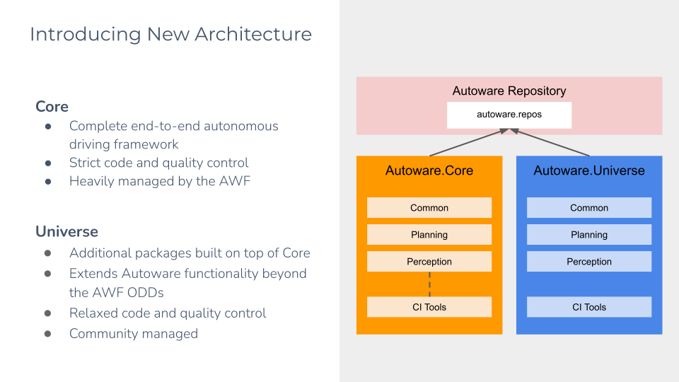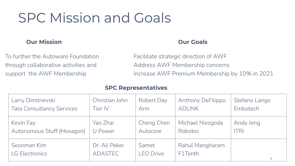 The Strategic Planning Committee (SPC), chaired by Larry Dimitrievski (Tata Consultancy Services) and co-chaired by Christian John (Tier IV), announced that two Working Groups (WGs) had been newly established. Led by Robert Day (Arm) and Anthony DeFilippo (ADLINK), Marketing WG and Go-to-Market (GTM) WG would be mainly focused on brand development, membership increase and engagement of end customers. Through various initiateves such as new alliances with AVC Consortium, eSync Alliance and MIH, as well as Autoware Center of Excellence, to be launched in early 2022, the Autoware Foundation will continue expanding its open-souce ecosystem.